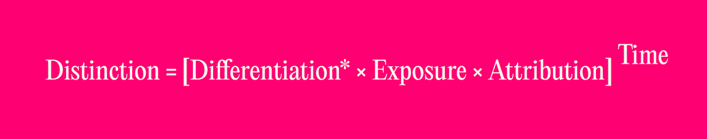 Distinction is not just being different; it’s being different in a way that people notice, remember, and come to associate with you. The Ehrenberg-Bass Institute has shown that brands with distinctive assets (shapes, colors, typefaces, mascots, phrases) are more easily recognized and recalled, and that this drives purchase preference. Distinction only becomes an asset when difference is reinforced consistently over time and clearly attributed back to the brand. This is why a one-off visual trick or campaign rarely moves the needle. It might spark curiosity, but without repetition it does not become distinctive. Different fades quickly unless it is owned.